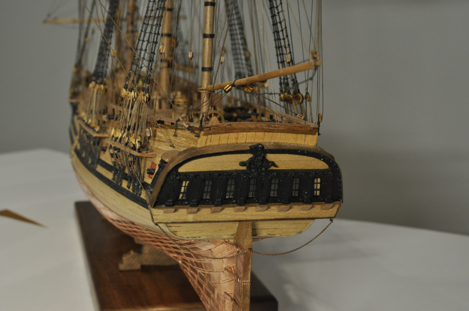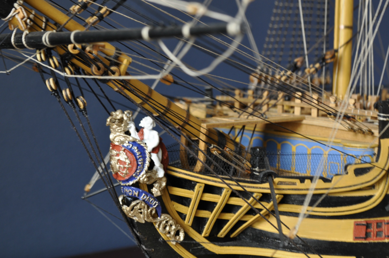 La Gloire is a classic French 34-gun frigate built in 1778 in St. Malo. La Gloire was 143 feet in length and carried 26 12-pound cannons on her main deck, along with 4 6-pound cannons and 4 carronades on her main deck. La Gloire was captured by His Majesty’s Ship Astraea of 32 guns after a close action of 58 minutes on 11 April 1795 in the English Channel. Her compliment was 280.